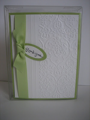 Here is a box set that I donated to our preschool to use as a door prize for our annual Sweetheart Banquet Fundraiser. Thanks to my friend Jill (you can find the link to her blog on the sidebar at Jill's Card Creations) who gave me the idea that the SU small note cards & envelopes fit in these boxes we have had forever! The size of the cards are 5" x 3 1/2" and they fit perfectly. There are 3 each of 2 different color combos for a total of 6 cards & envleopes in the box. I used Twitterpated by SEI to decorate the cards & box. I hope the person who wins likes them! I have more sets that I have donated and will show them later this week.